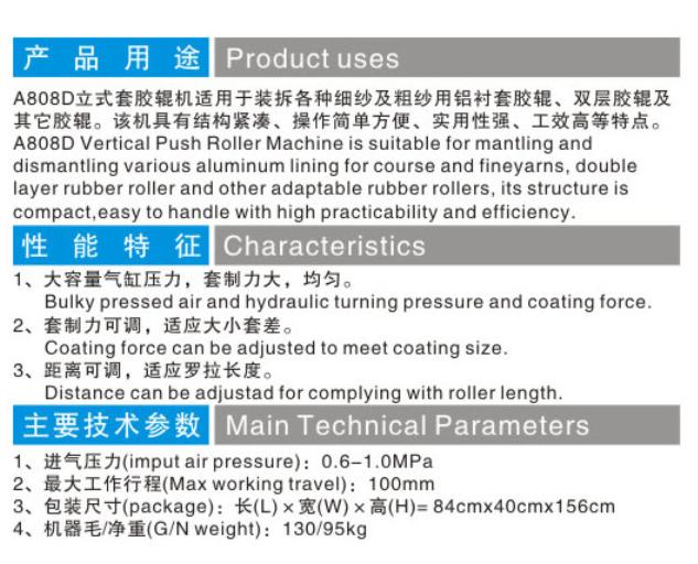适用于粗、细纱胶辊、铝衬胶辊、双层胶辊的套制和剥离。采用压缩空气,杜绝了皮辊油污,清洁节能.