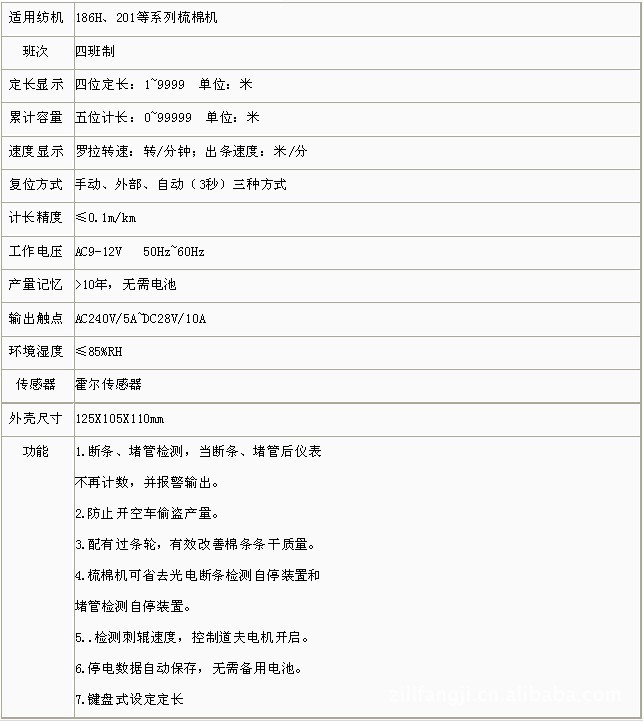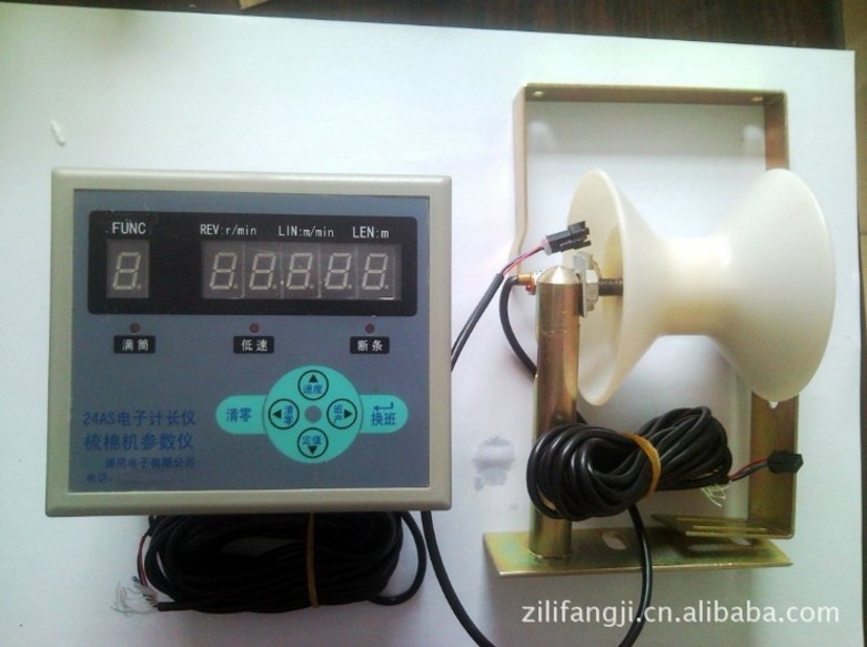 1.断条、堵管检测,当断条、堵管后仪表不再计数,并报警输出。 2.防止开空车偷盗产量。 3.配有过条轮,有效改善棉条条干质量。 4.梳棉机可省去光电断条检测自停装置和堵管检测自停装置。 5..检测刺辊速度,控制道夫电机开启。 6.停电数据自动保存,无需备用电池。 7.键盘式设定定长 |